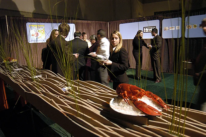 Pairing a local restaurant and design firm for a one-night “taste of the town” event, we designed, fabricated and installed an environment which could be assembled in an less than an hour and embodied the menu and regional cuisine served for the evening. Minimal budget required creative solutions- simple picnic bench like frames and recycled newspapers harken back to a “good ‘ol lobsta boil” of my youth. Fabricated with mild cold-rolled steel and Homosote sheet goods, the extended “pier” allows dinners to experience the sand dunes, sea and salty air which make Cape Cod such a popular destination for lobster.