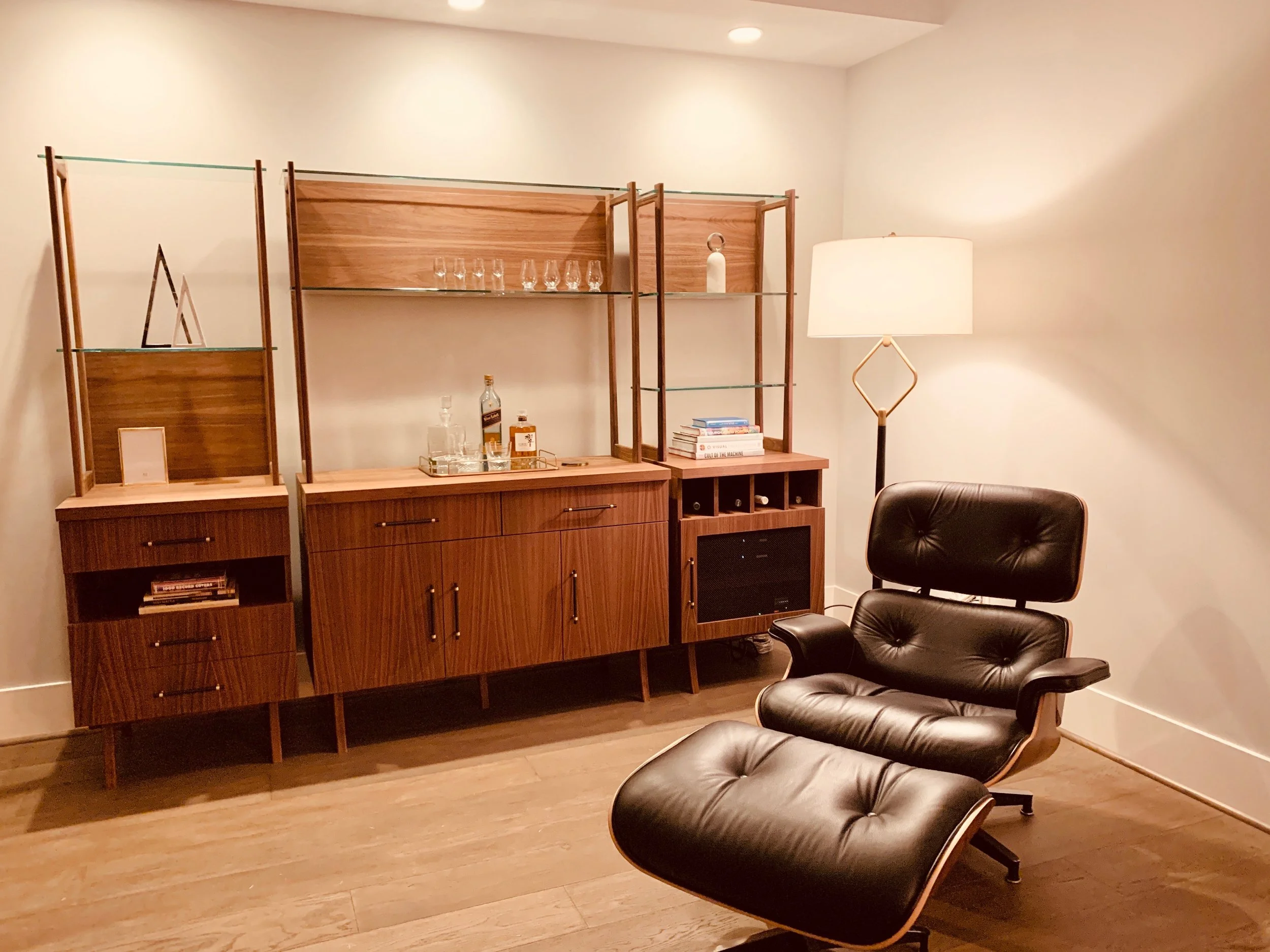 Living in a short-term residence, our client asked for a storage solution which will allow for immediate use as well as an adaptive configuration for his future home. Combining storage for cocktails, media and memorabilia, the triple unit allows for reorganization as needed. Built of architecture grade Walnut Plywood, solid Walnut, blackened steel and glass. The units feature full extension soft close hardware, hand-cut dovetail drawers with blackened steel hardware with brass accents.